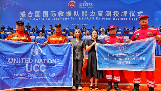 Recently, the China Rescue Team (CRT) and China International Search and Rescue Team (CISAR) have successfully passed the re-accreditation of the UN International Heavy Urban Search and Rescue (USAR) Teams. On May 29, the UN’s re-accreditation award ceremony for international heavy USAR teams was held in Beijing. Xu Jia’ai, Vice Minister of the Ministry of Emergency Management, and Sarah Maskell, Representative of the United Nations Office for the Coordination of Humanitarian Affairs (OCHA), attended the ceremony and delivered speeches. Xu Jia’ai stated that the Chinese government has always attached great importance to international humanitarian rescue work. The Ministry of Emergency Management resolutely implements the spirit of a series of important instructions and directives by President Xi Jinping, and always adheres to the principle of "Put People and Their Lives First" . It regards capacity building as a fundamental project and firmly presses ahead with it, fully promoting the two teams to continuously their development concepts, consolidate infrastructure, emphasize practical training and exercises, refine technical tactics, maintain emergency readiness at all times, and fulfill the glorious mission of UN International Heavy Urban Search and Rescue Teams. He expressed the hope that taking the successful re-accreditation as a new starting point, the two teams will continue to carry forward fine traditions, temper their fighting will, and intensify training in rescue skills, striving to become elite forces capable of efficiently performing emergency rescue tasks both at home and abroad. The Ministry of Emergency Management will, as always, support and participate in global international rescue affairs, especially those in the Asia-Pacific region, and contribute more Chinese strength to advancing the building of a global community of shared future . Sarah Maskell presented certificates to the two teams, congratulating them on successfully passing the re-accreditation of the UN International Heavy Urban Search and Rescue Teams with outstanding performance. She also thanked the Chinese government for its remarkable contributions to international humanitarian affairs and expressed the expectation that the two teams would play a greater role in international humanitarian rescue operations. From May 27 to 28, the United Nations Office for the Coordination of Humanitarian Affairs (OCHA) and the International Search and Rescue Advisory Group (INSARAG) organized 18 international assessment experts from 14 countries to conduct a rigorous, comprehensive and standardized evaluation of the two teams. Following over 40 hours of high-intensity, non-stop practical earthquake search and rescue drills, the international assessment experts reached a unanimous decision that the China Rescue Team and the China International Search and Rescue Team passed the re-accreditation. More than 60 experts in the global rescue field, along with members of the National Comprehensive Fire and Rescue Force, the China Hong Kong Rescue Team and social emergency rescue forces, observed the re-accreditation exercise on site. To date, a total of 33 rescue teams worldwide have passed the UN International Heavy Urban Search and Rescue (USAR) Team assessment. Established in August 2018, the China Rescue Team has passed the assessment twice. For its part, the China International Search and Rescue Team, founded in April 2001, has obtained the accreditation on four occasions.