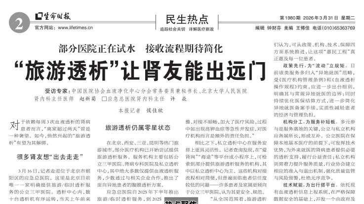 血液净化方面,科室不断探索,一直前进,除普通血液透析、血液灌流、在线血液滤过治疗外,在双膜血浆置换、CPFA、蛋白A吸附等方面也积累了丰富经验,成功救治了很多患者,包括多脏器功能衰竭这样的危重症病例;同时我们前瞻性地开拓了双膜血浆置换、免疫蛋白A吸附等特殊血液净化技术在慢性冠脉综合征血脂净化、风湿免疫性疾病,以及其他自身免疫性疾病的临床治疗。在提升透析患者生活质量方面,中心和台湾、日本、欧洲等透析旅游组织一起,成立了北京市首个旅游透析中心,组织肾友前往台湾、北海道多地旅游透析,也接纳了来自各地的旅游肾友,收到肾友好评。