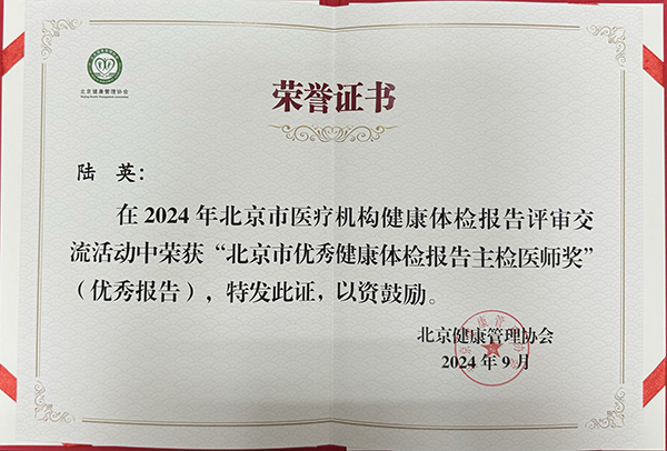 春华秋实,岁物丰成。9月20日,在北京健康管理协会主办的第十九届北京健康管理论坛暨北京健康管理协会第十六次年会上,评出了11家“北京市优秀健康体检报告医疗机构(优秀单位)”和12名“北京市优秀健康体检报告主检医师”。应急总医院体检中心在近300家参加评审的体检机构中脱颖而出,荣获“北京市优秀健康体检报告医疗机构(优秀单位)”奖,陆英主任继2022年获得“优秀报告”奖后再次被评为“北京市优秀健康体检报告主检医师”奖。