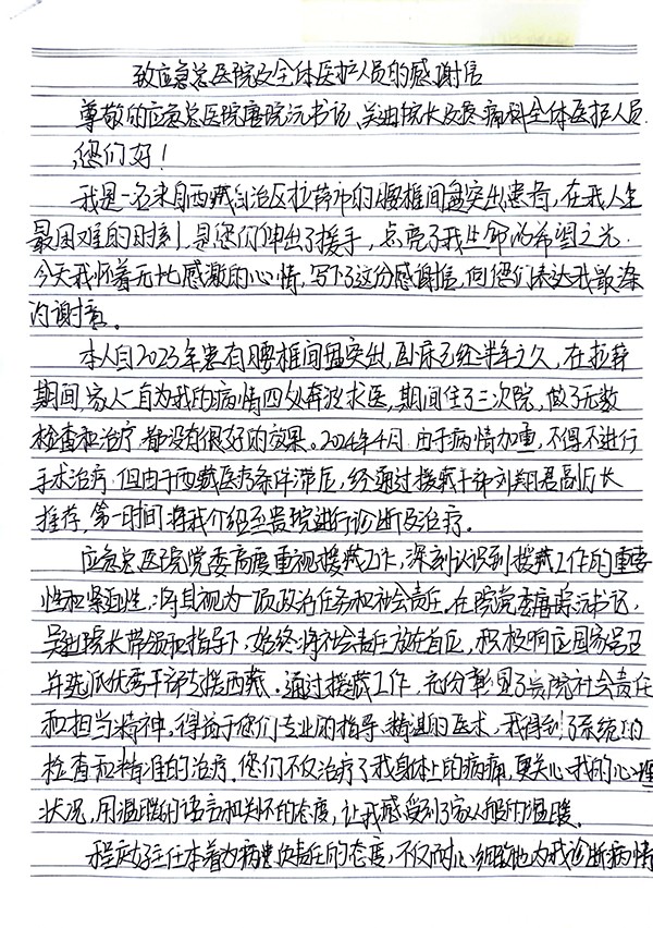 在住院期间,患者深切感受到了应急总医院疼痛科全体医护人员的关怀与温暖。他们每一次细致入微的治疗、每一次暖心的问候,都让患者感受到了无尽的关爱与帮助。医护人员不仅治疗了患者的身体疼痛,更帮助他们解决了实际困难,让患者倍感温暖和感动。