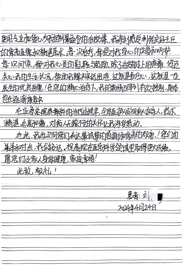 除了赠送锦旗,患者及家属还专门写了一封感谢信,字里行间表达了对应急总医院及疼痛科程庆好主任团队的感激之情。