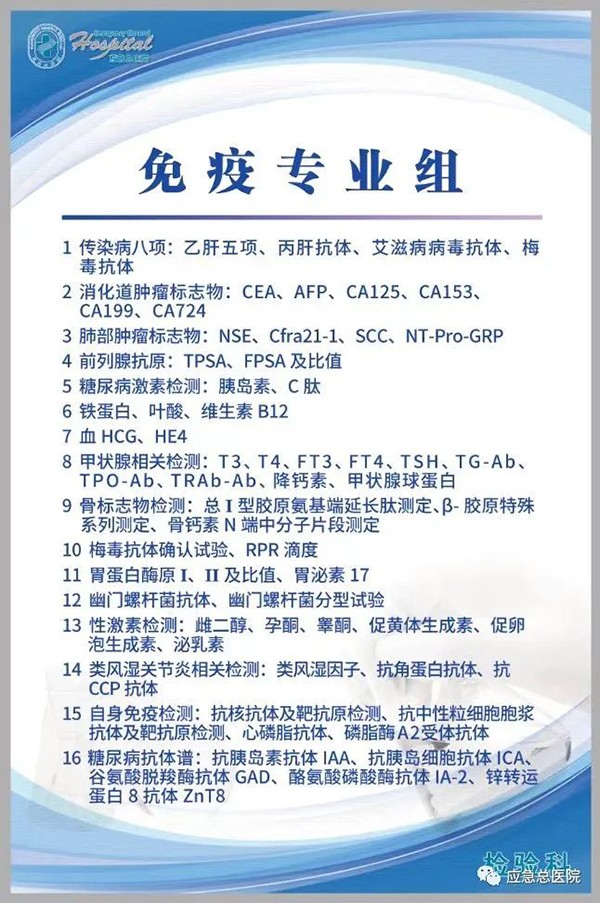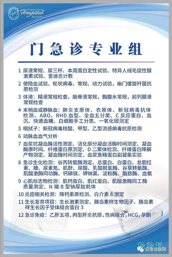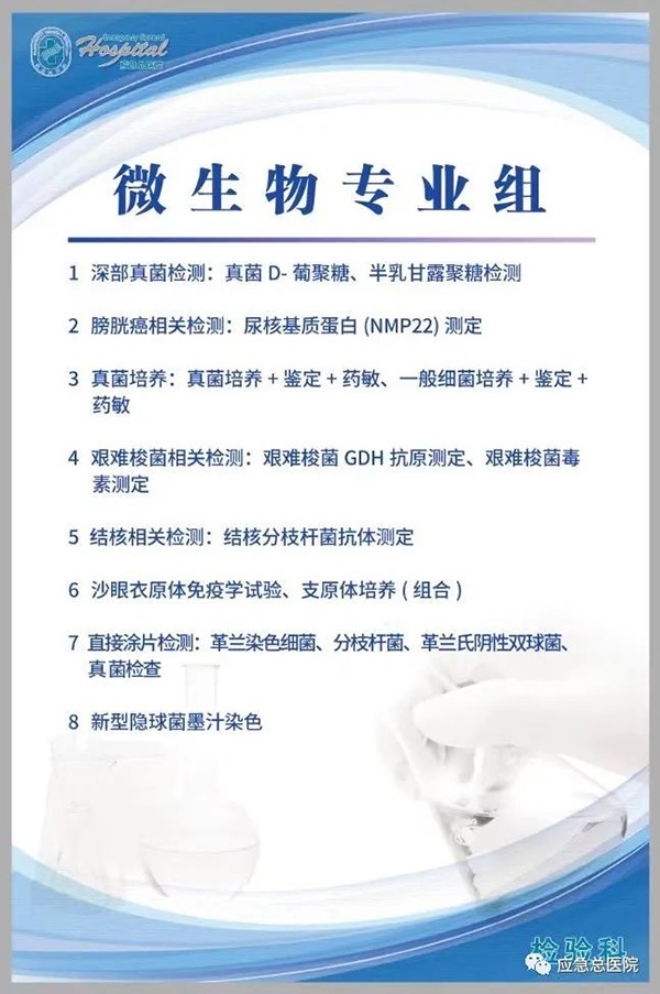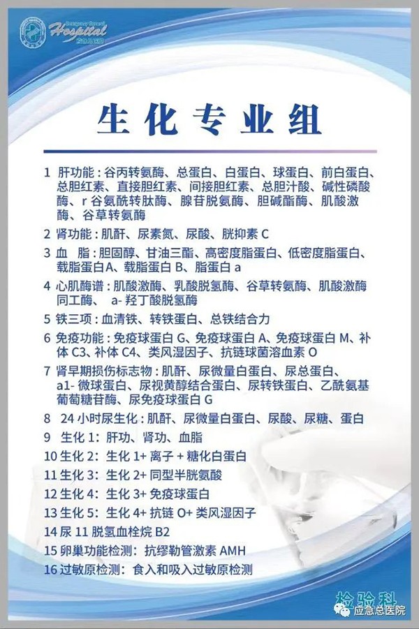 目前,检验科下设微生物、生化、免疫、临床检验、门急诊检验、分子生物学六个专业组,各工作室布局合理,内部宽敞明亮、整洁有序,可以最大限度满足临床和患者的需求。