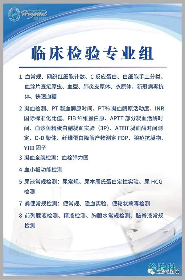 检验科目前拥有大型仪器设备30余台/套,包括具有先进水平的细菌培养鉴定仪、微生物质谱仪、生化免疫流水线、血细胞分析流水线、凝血分析仪、核酸扩增仪、核酸检测工作站等一批检验仪器设备。