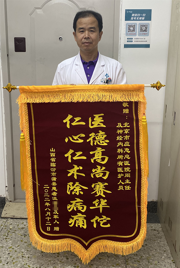 近日,应急总医院神经内科主任周卫东率团队为一名患者解决困扰半年的顽固性呕吐,更可喜的是,凭借精湛的医术和丰富的临床经验,还让患者重新站立及行走。患者专门为周卫东主任制作了一面锦旗:仁心仁术除病痛,医德高尚赛华佗。