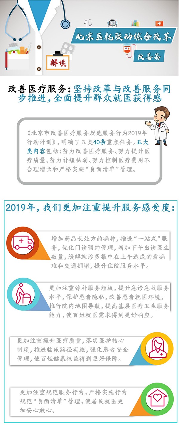 北京市卫生健康委按照“改革与改善同步推进、全面提升群众就医获得感”的原则,制定了《北京市改善医疗服务规范服务行为2019年行动计划》,明确了5类40条重点任务。
